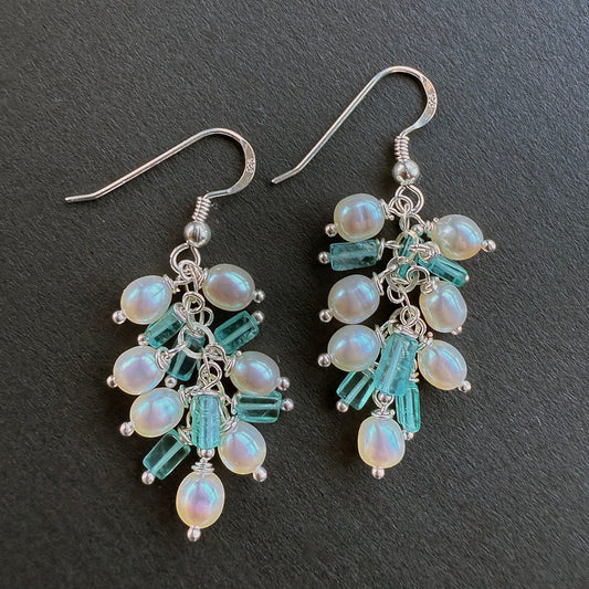 Blue Apatite and Pearl Cluster Drop Earrings on Sterling Silver by Linda Queally