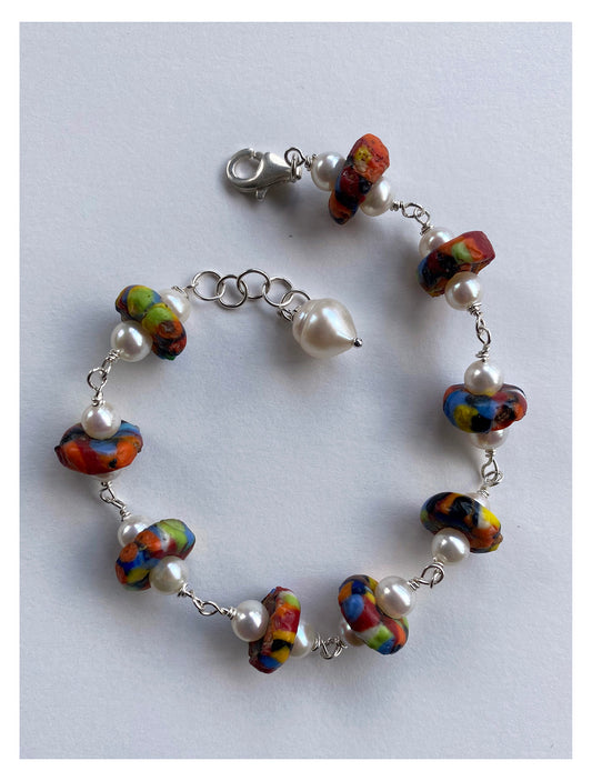 African Recycled Glass and Freshwater Pearl Bracelet by Linda Queally