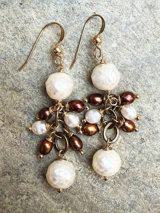 Bronze and White Pearl Cluster Drop Earrings on 14k GF Wires by Linda Queally