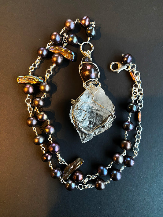 Mermaid on Quartz Crystal Art Necklace with Bronze Pearls and Sterling Silver by Linda & Lalo