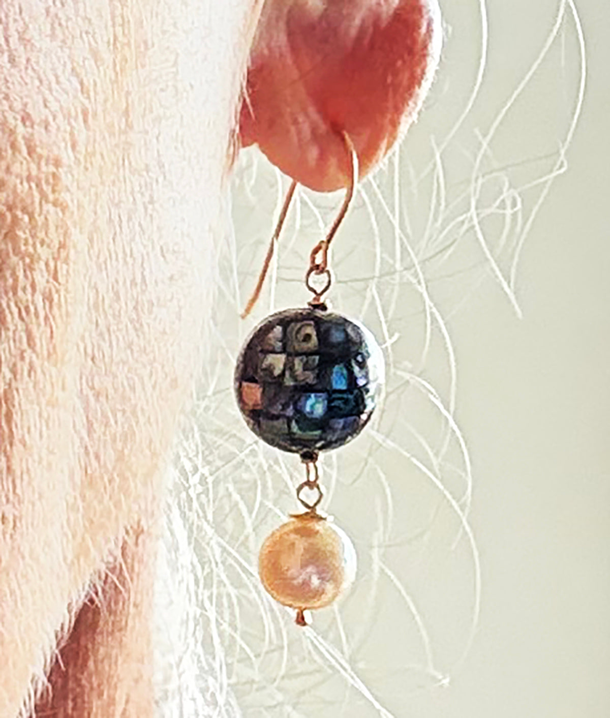 Abalone Inlay Mosaic Earrings with Pearl Drop on 14k GF Ear Wires by Linda Queally
