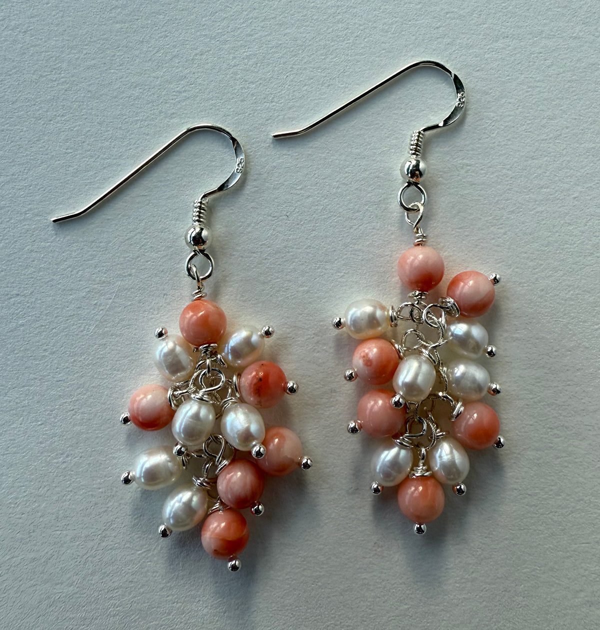 These cluster drop earrings from my Jellyfish collection feature six rare4mm round angelskin coral beads from a vintage strand, combined with two 4mm round and five 4mm white freshwater rice pearls.